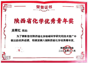 会议期间,陕西省化学会对省内化学领域取得突出成就的个人进行表彰,我院连菊红老师凭借在化学领域科学研究方面的优异表现与突出成果,成功斩获“第六届陕西省化学优秀青年奖”。据悉,该奖项是陕西省化学领域青年学者的重要荣誉,本次仅评选出10位获奖者,充分体现了对青年化学工作者学术能力与科研潜力的高度认可。